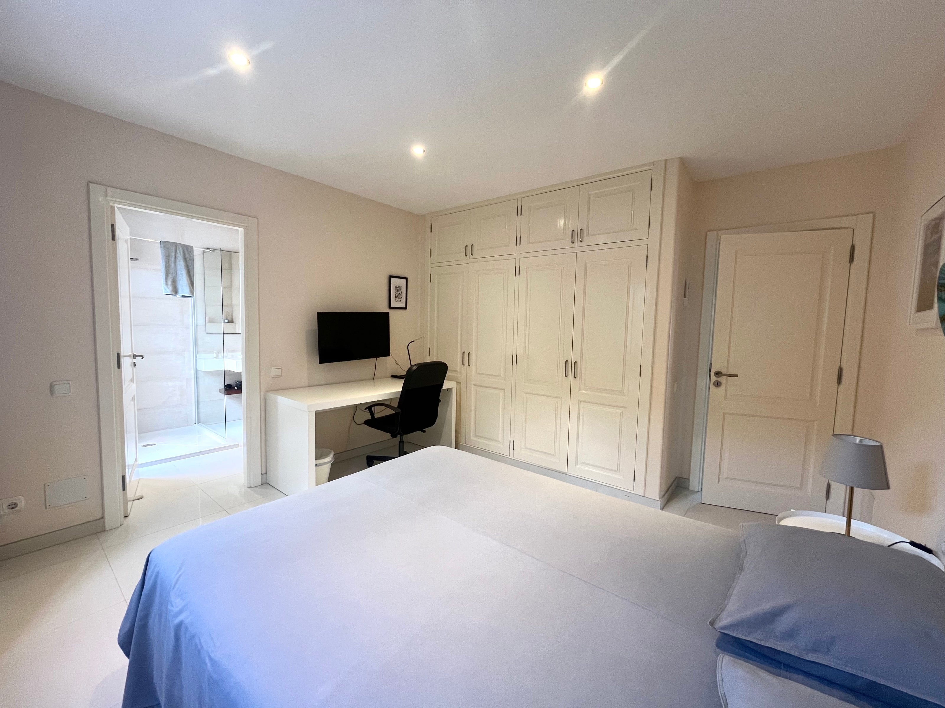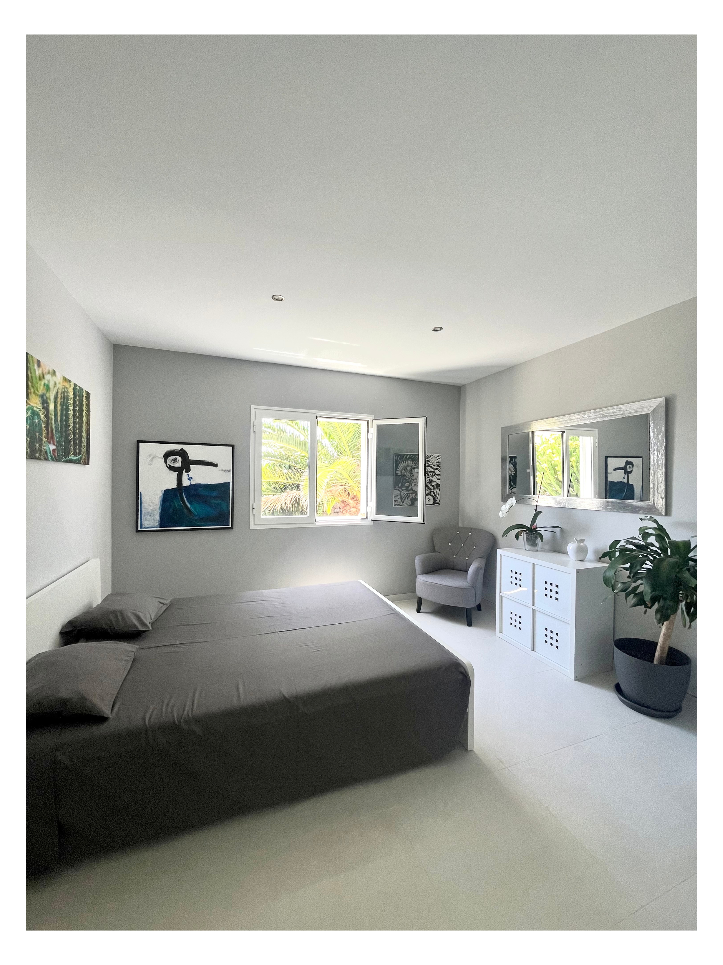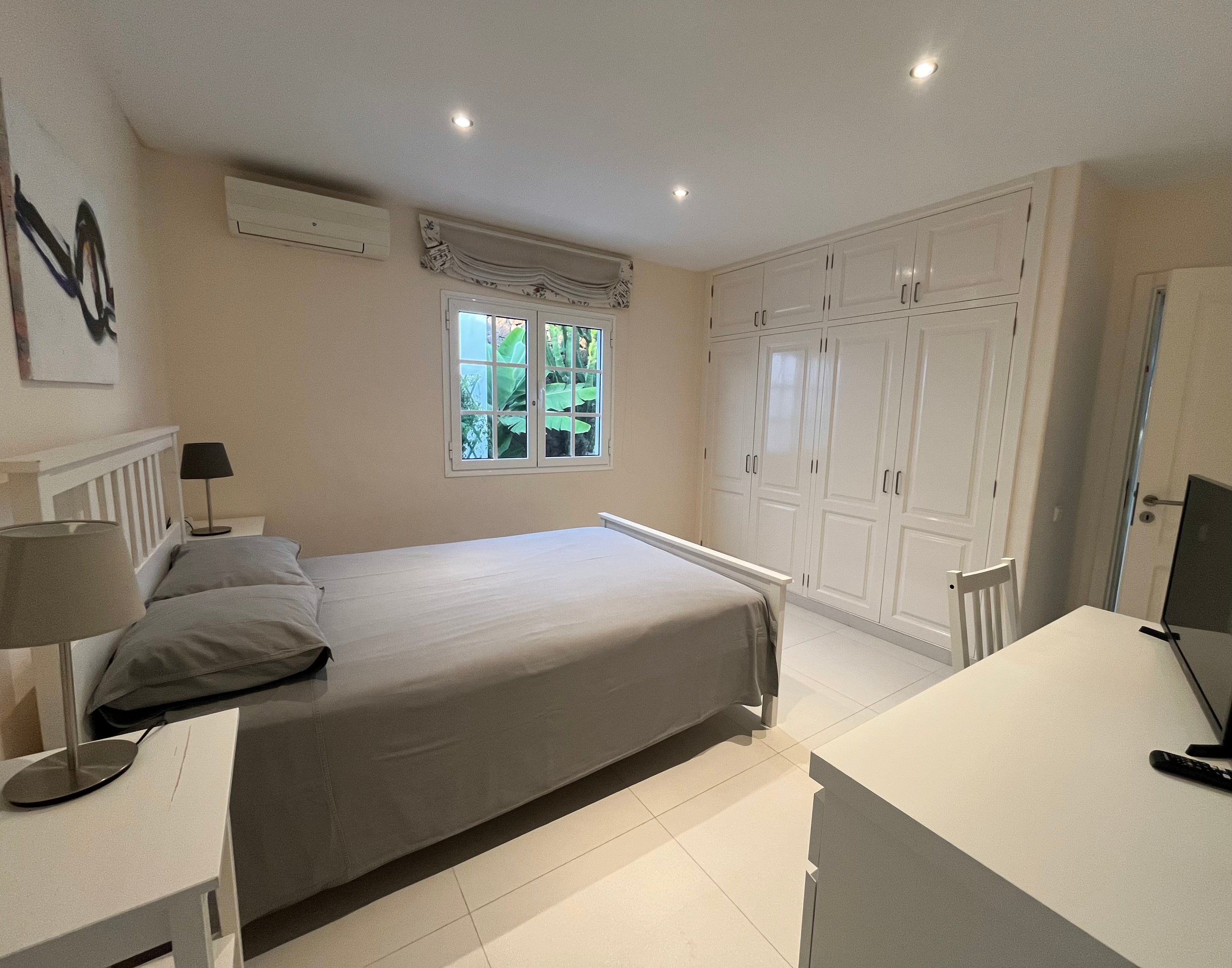 3 bedrooms have a private bathroom for each room, 3 bedrooms have Smart Tv and Air conditioner. The 4 bedroom is the room which overlooks the garden called the “Green bedroom” no Tv just green and art on the wall to recharge from a digital world and the 4th guest bathroom along the corridor.